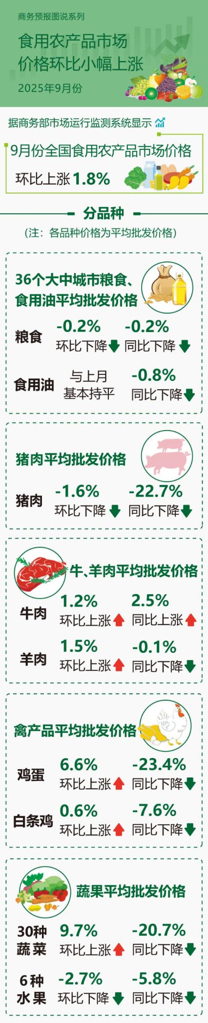 商务部:9月份食用农产品市场价格环比小幅上涨