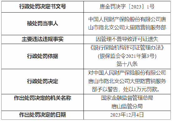 因管理不善导致许可证遗失 人保财险一营销服务部被罚