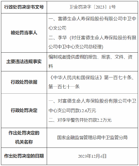因编制或者提供虚假的报告等 富德生命人寿中卫中心支公司被罚12.6万元