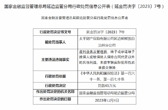 因虚列业务及管理费等 太平财险延边朝鲜族自治州分公司被罚45万
