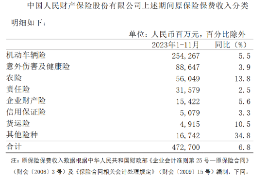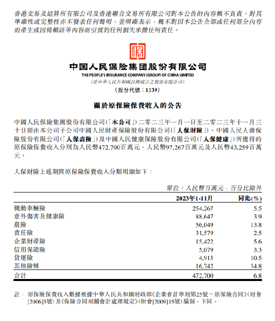 中国人民保险集团:前11个月人保财险原保险保费收入同比增加6.8%至4727亿元