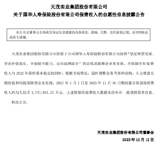 国华人寿前11月保费收入约374.79亿元