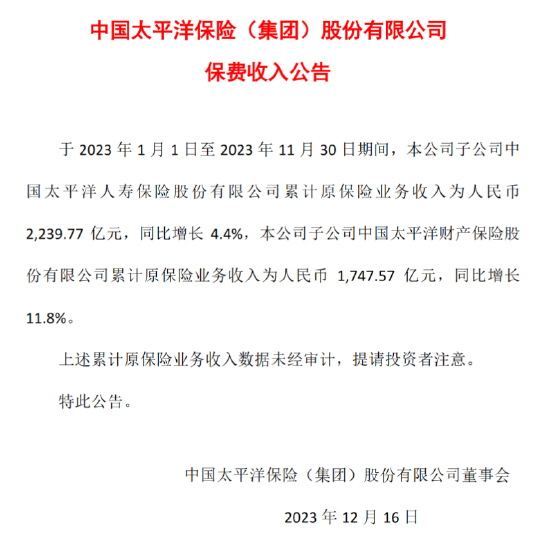 中国太保:前11月子累计原保险业务收入3987.34亿元