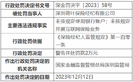 因未按规定使用银行账户等 深圳荷叶保险经纪被罚