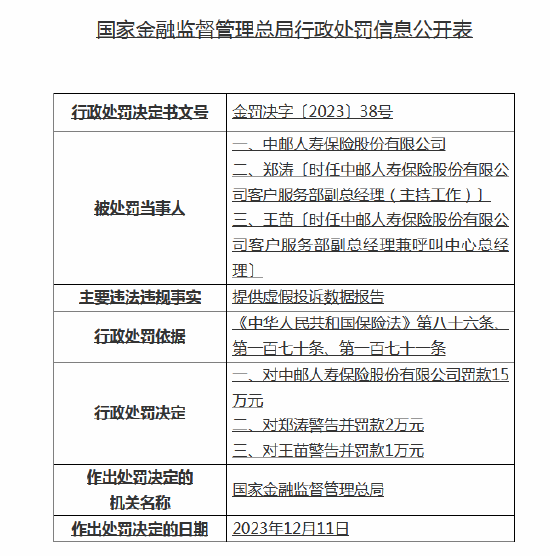 中邮人寿因提供虚假投诉数据报告被罚15万 两名高管被处罚