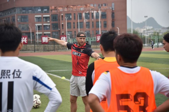 “向前,向前”“传球、喊名字”,在贵州大学体育学院旁的田径场上,31岁的英国人大卫·吉里正在带领校足球队进行日常训练,指导球员如何配合,话语间充满激情与活力。