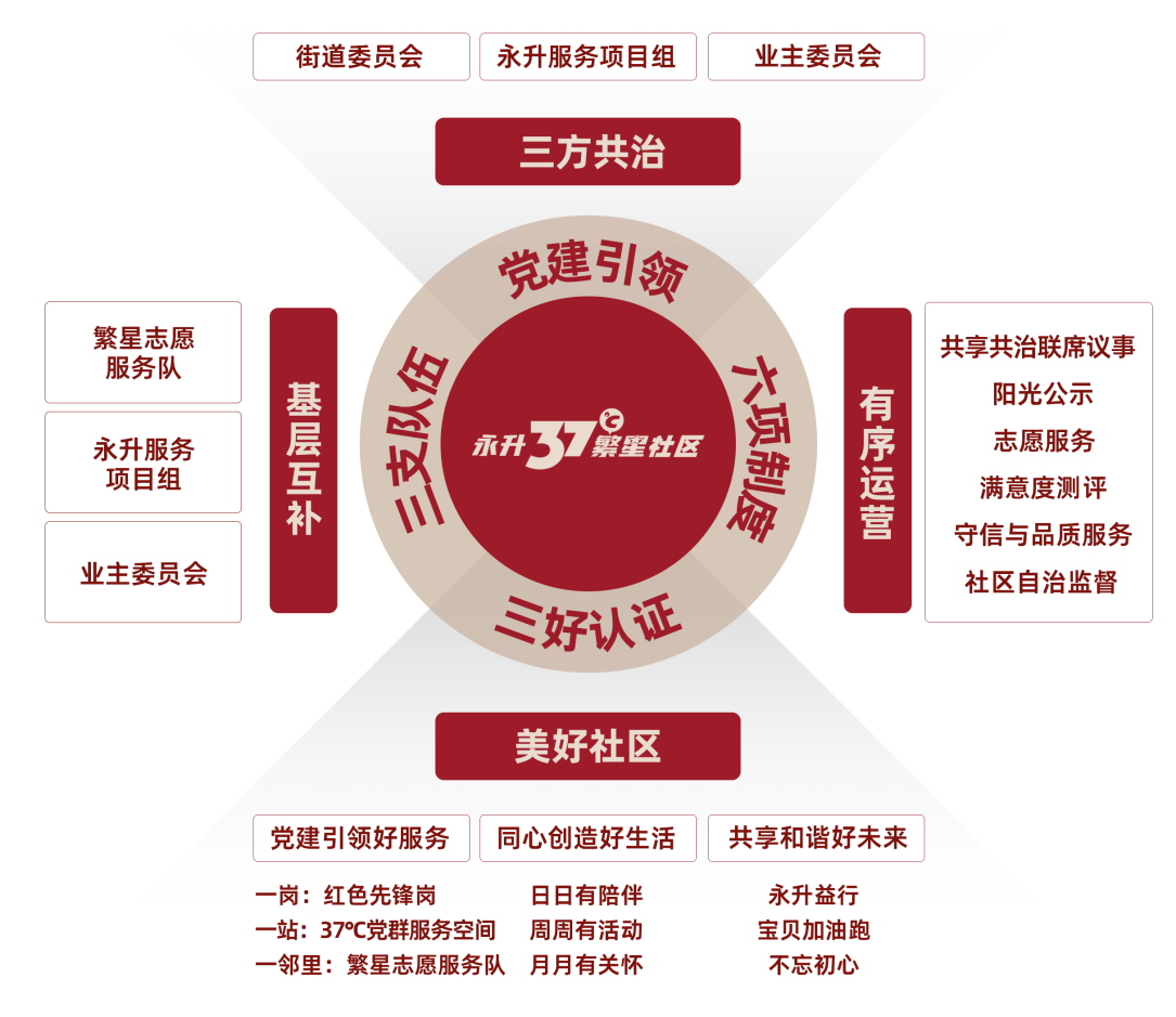 2023年7月,永升服务在青岛德郡、嘉富丽苑、正阳府、博观一品等社区落地“永升37度繁星社区”党建引领基层治理服务模式。以党建引领、社区共治为指引,以社区、物业服务团队、繁星志愿服务队三支基层队伍为基石,打造好服务、好生活、好未来的“三好社区”。