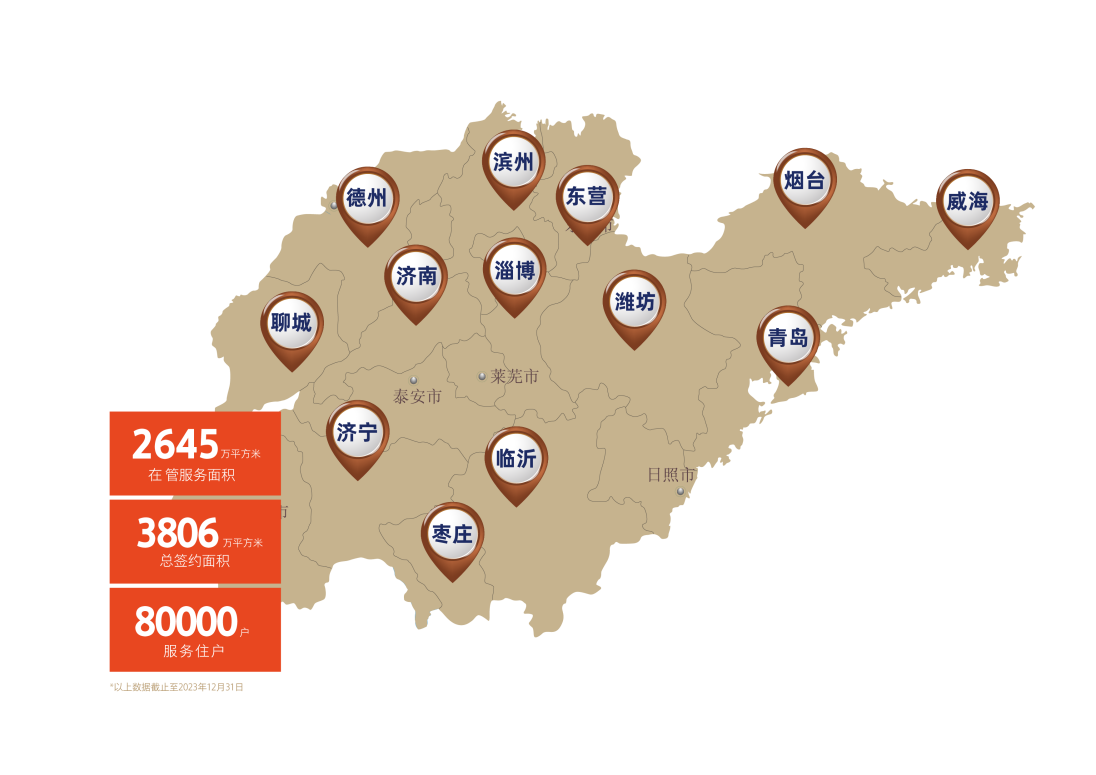 自2019年起,永升服务发力山东区域,实现了城市业务版图的高质量布局。截至2023年12月31日,公司品质服务覆盖青岛、济南、临沂、潍坊、烟台、济宁、淄博、滨州等城市,服务中项目132个,服务中案场52个,服务业主8万户,客户满意度超90%,提供就业岗位近5000个。服务业态涵盖住宅、写字楼、学校、产业园、医院等,物业服务、到家服务、社区零售、美居服务、经纪服务、智慧服务等业务类型百花齐放。