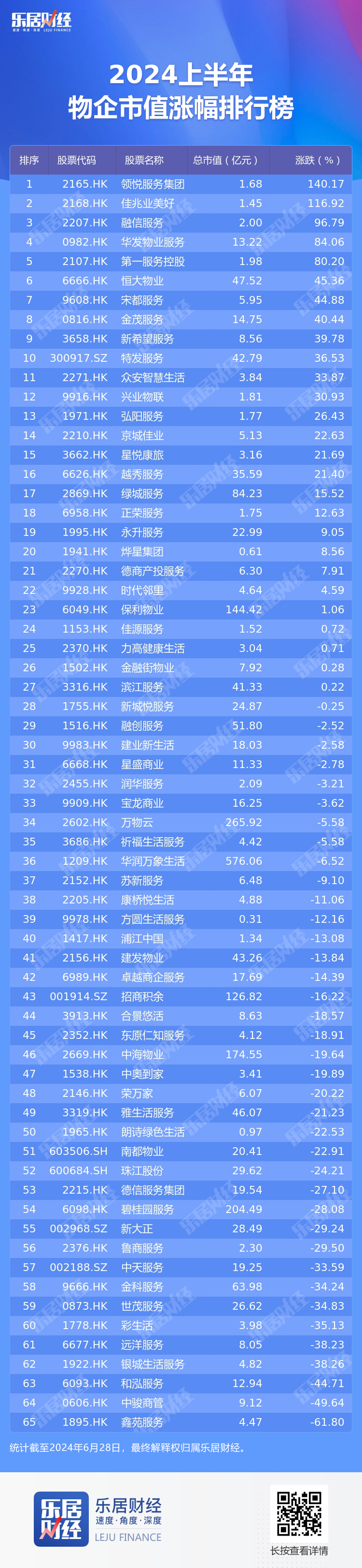 据乐居财经统计,2024上半年,65家上市物企42%市值增长,增幅最高达140.17%;58%市值下滑,市值最高缩水61.8%。