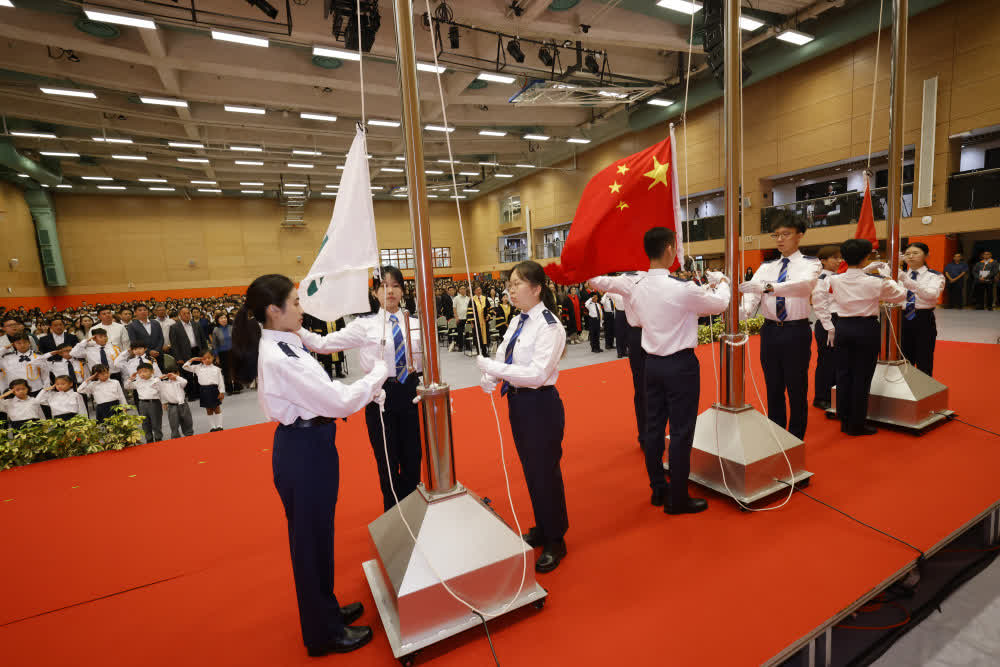升旗儀式由教大副教務長李偉展博士主持,教大學生聯同教大賽馬會小學和教大幼兒發展中心的學生組成升旗隊,在雄壯的國歌聲中冉冉升起國旗、區旗及校旗,彰顯教大愛國愛港、和諧團結和薪火相傳的精神。