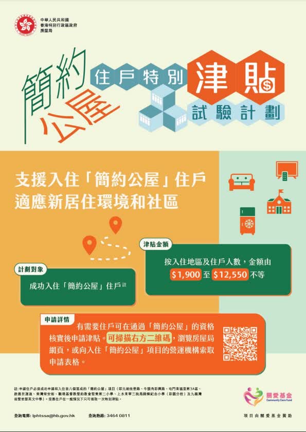 為配合快將陸續落成入伙的「簡約公屋」,房屋局今日(3日)公布推出「『簡約公屋』住戶特別津貼試驗計劃」(「試驗計劃」),協助有需要的住戶更快投入新社區。