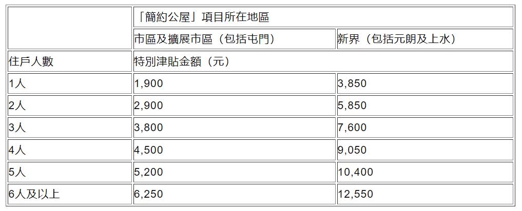 獲發放的津貼金額視乎住戶同住的家人數目和入住項目的地區,有關津貼金額表列如下: