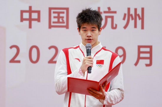9月3日,游泳运动员潘展乐在活动中领读“体育力量 青春榜样”倡议书。新华社记者 江汉 摄
