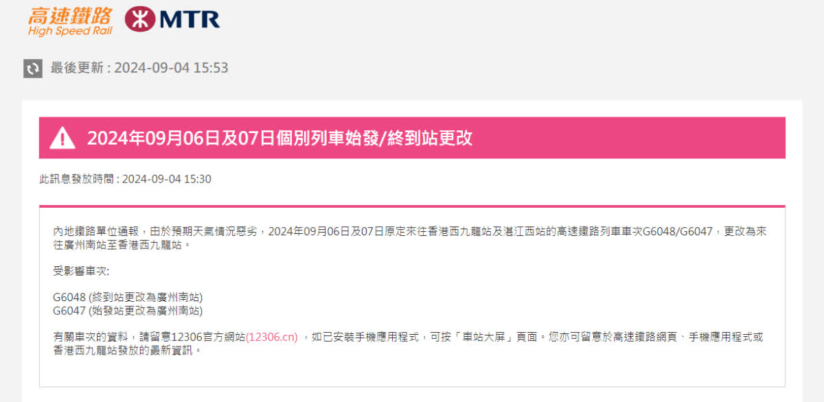 运输署今午(4日)表示,接獲內地鐵路單位通報,受颱風「摩羯」影響,預期天氣情況惡劣,周五(6日)和周六(7日)原定來往西九龍站及湛江西站的高鐵列車G6048和G6047,更改為來往廣州南站至西九龍站。
