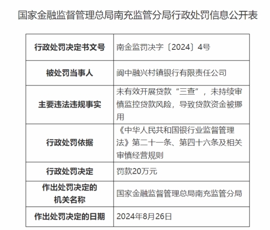 国家金融监督管理总局南充监管分局依据《中华人民共和国银行业监督管理法》第二十一条、第四十六条及相关审慎经营规则,对阆中融兴村镇银行有限责任公司罚款20万元。