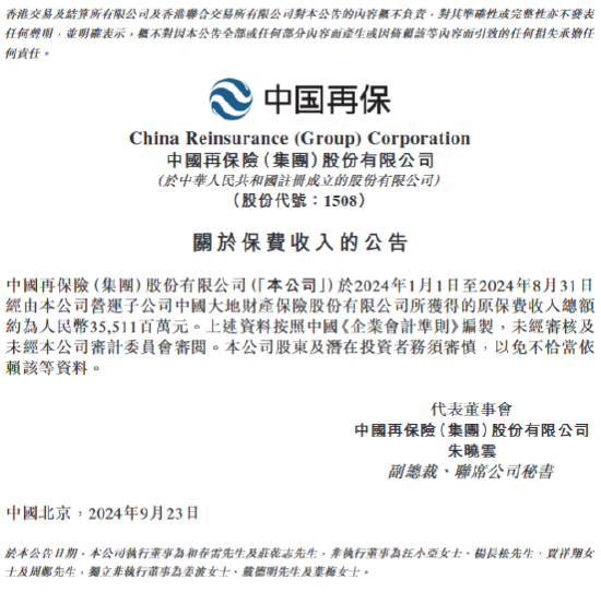 9月23日金融一线消息,中再保险发布保费收入公告显示,公司于2024年1月1日至2024年8月31日经由公司营运子公司中国大地财产保险股份有限公司所获得的原保费收入总额约为人民币355.11亿元,较上年同期348.42亿元增长1.9%。