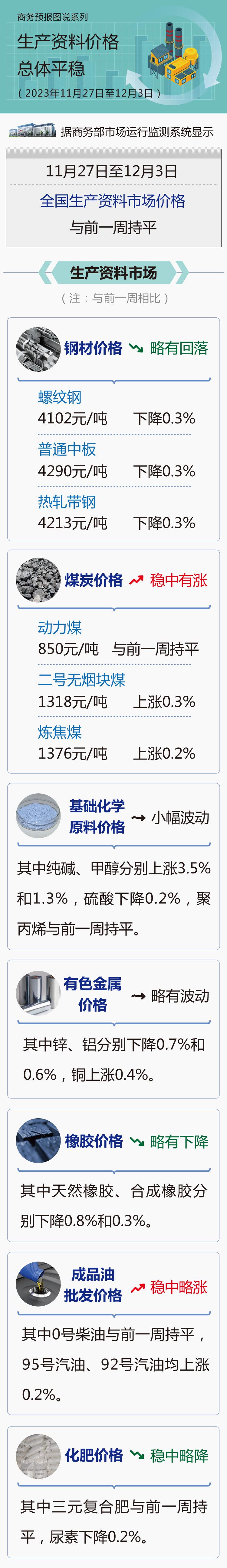 据商务部市场运行监测系统显示,11月27日至12月3日,全国生产资料市场价格与前一周持平。