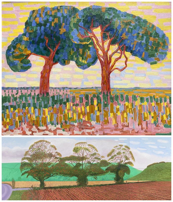 上图:《两棵树》(Two Trees),雅格巴·凡·希姆斯凯克(Jacoba van Heemskerck,1876-1923),1910,荷兰海牙美术馆藏品(Kunstmuseum Den Haag);下图*:《蒂克森代尔的三棵树(秋景)》(Three Trees near Thixendale-Autumn),大卫·霍克尼(David Hockney,1937年7月9日-),2007-2008,©伍尔特收藏(Würth Collection / Sammlung Würth)