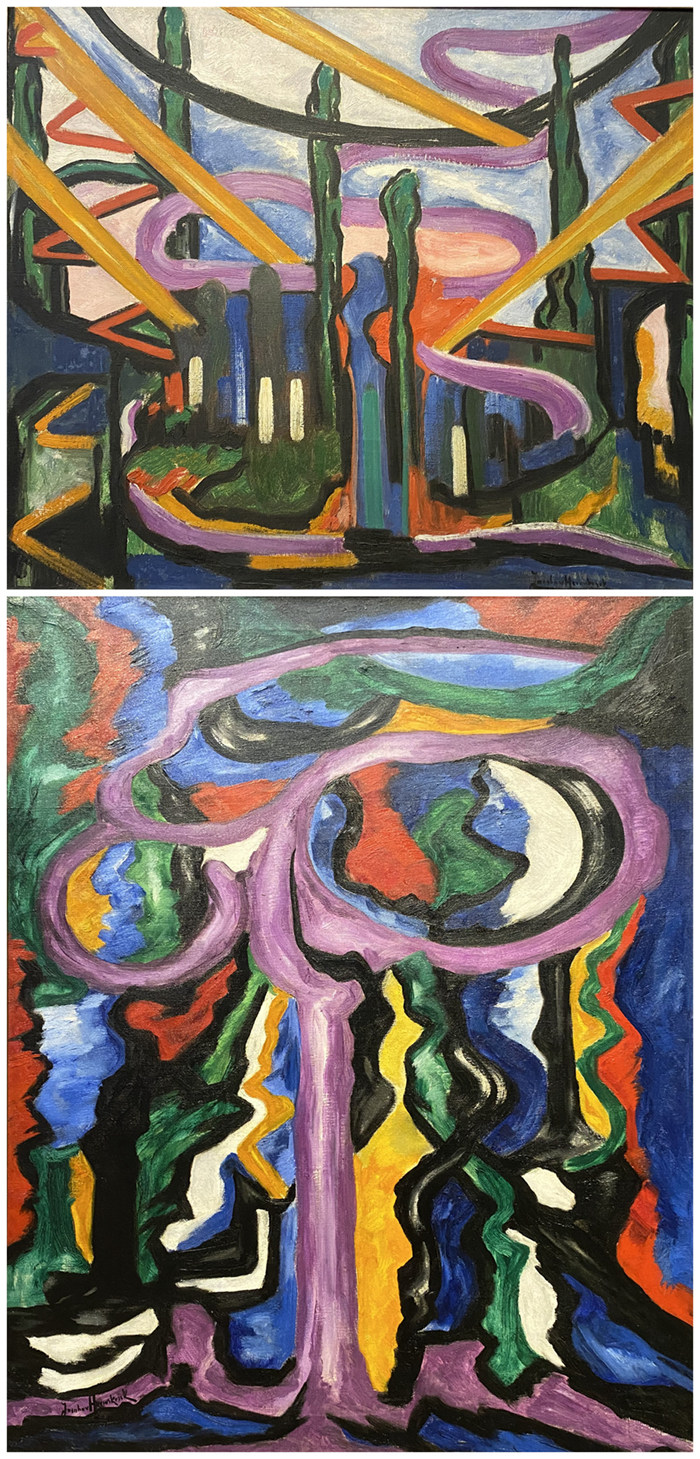 雅格巴·凡·希姆斯凯克(Jacoba van Heemskerck,1876-1923),上图:《86号组合物》(Composition No.86),1918,荷兰拉伦辛格博物馆藏品(Singer Laren);下图:《107号组合物》(Composition No.107),1920,荷兰海牙美术馆藏品(Kunstmuseum Den Haag)