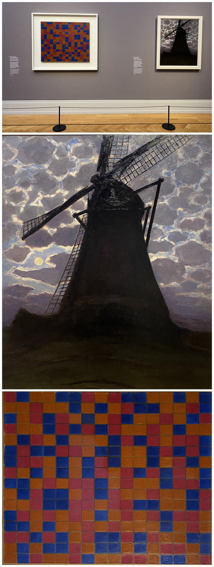 皮特·蒙德里安(Piet Mondrian,1872-1944),荷兰海牙美术馆藏品(Kunstmuseum Den Haag),中图:《夜风车》(Windmill in the Evening),1917;下图:《网格8的组成》(Composition with Grid 8 ),1919