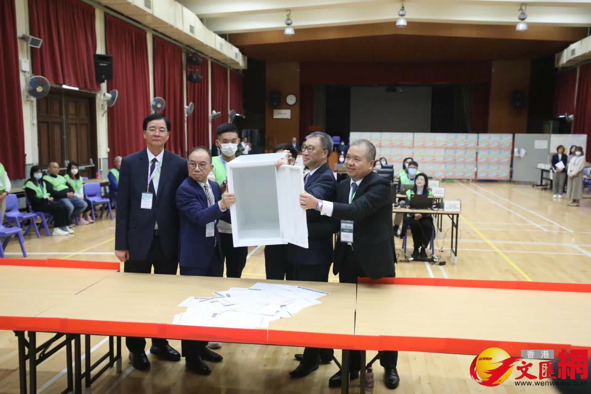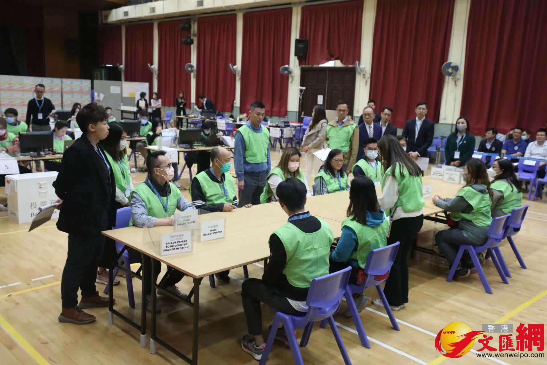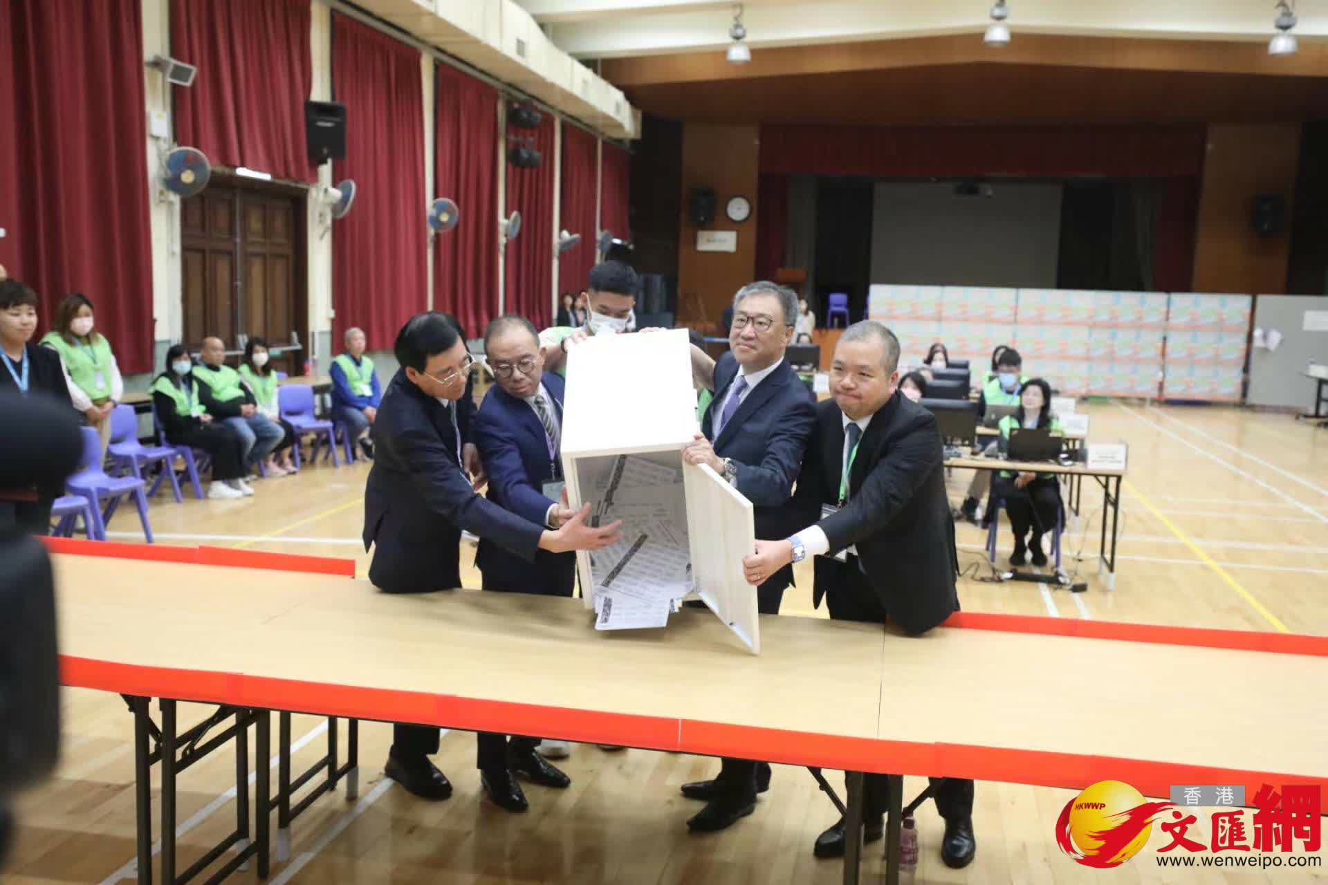 選管會主席陸啟康,以及政制及內地事務局局長曾國衞等巡視點票站,並即場開票。(香港文匯報記者黃艾力 攝)