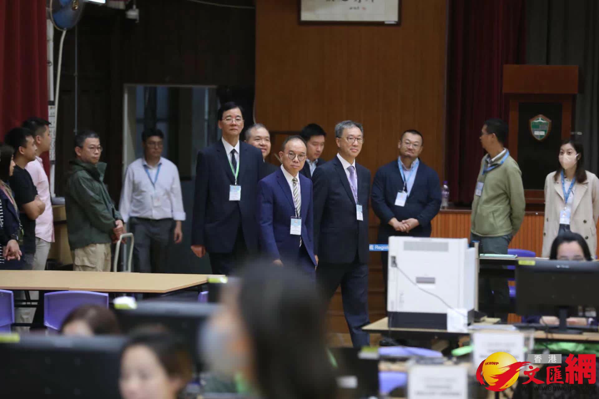 選管會主席陸啟康,以及政制及內地事務局局長曾國衞等巡視點票站。(香港文匯報記者黃艾力 攝)