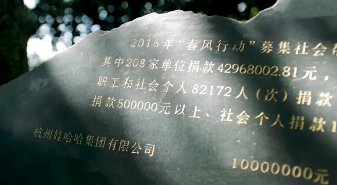 娃哈哈也积极投身社会公益事业,累计公益捐赠超7亿元,其中资助教育4.8亿元。2000年,杭州市开展第一次“春风行动”,娃哈哈是“春风行动”最早的参与者之一。截至2023年,娃哈哈向“春风行动”的累计捐赠金额达1.346亿元,娃哈哈为杭州“春风行动”刷新的最新纪录,是“春风行动”累计捐赠金额最多的捐赠方,帮助超5万名困难学生圆了“大学梦”。
