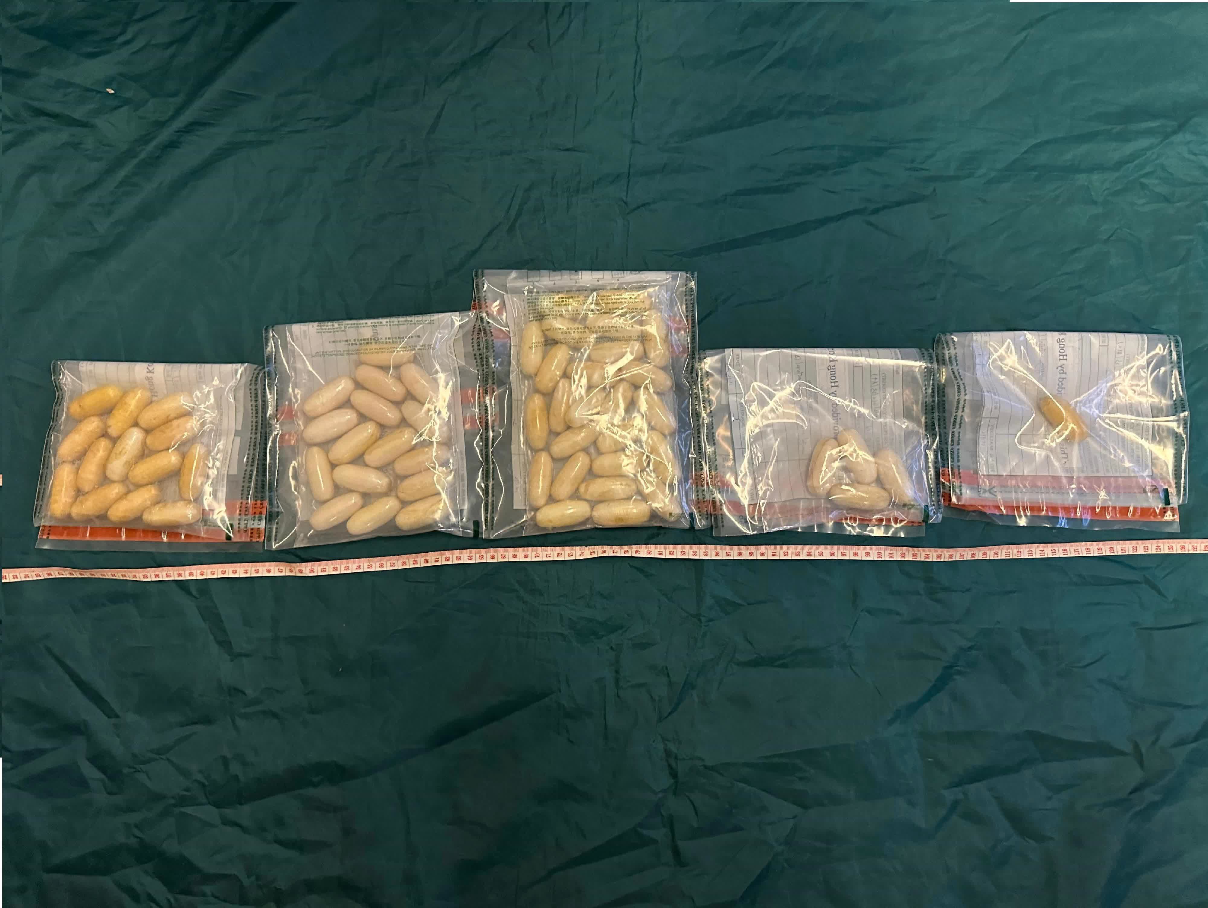 經檢查後,醫生確認該名男子體內藏有異物,海關人員隨即把他拘捕。截至今日(22日)下午5時,被捕男子已從體內排出59粒共重約1.1公斤的懷疑可卡因。目前案件仍在調查中。