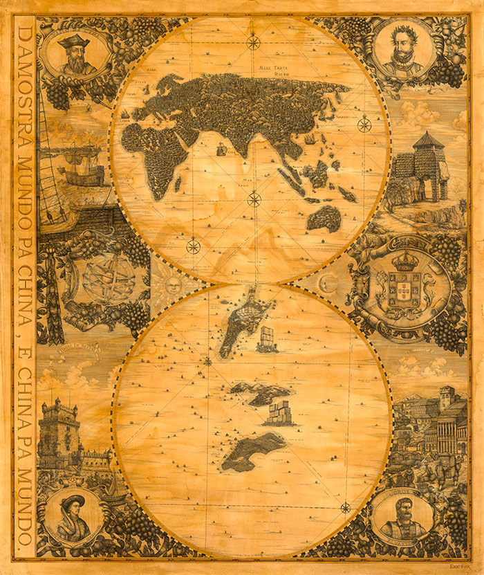 在《长颈鹿与麒麟之相遇》这幅数字艺术作品中,随着镜头的移动,公众可以透过针笔画仿古地图所描绘的海上丝绸之路,沿着葡萄牙里斯本,穿越海洋、到达澳门,从而开启澳门成为 15至17世纪全球贸易网络中心枢纽的历史。
