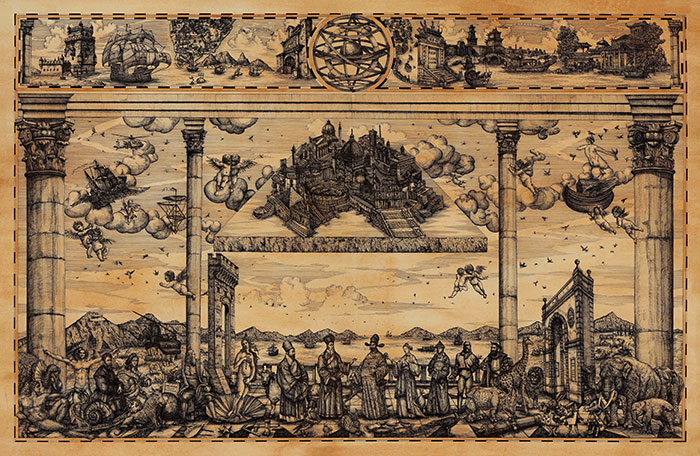 霍凯盛 《乐园– 1557》 纸本针笔画 220 x 260cm 美高梅收藏,这是艺术家的第一幅大型绘画作品(约 3 米),完整描绘了澳门在其开阜时的黄金时代,展示了它在东方历史中的西方地位。