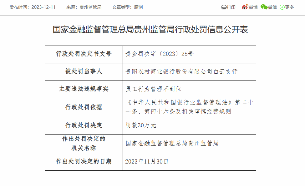 据国家金融监督管理总局贵州监管局行政处罚信息公开表显示,贵阳农村商业银行白云支行因员工行为管理不到位,被罚款30万元;作出处罚决定的日期为2023年11月30日。
