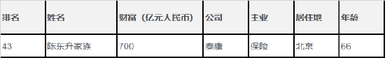 12月13日,据金融一线消息,胡润研究院今日发布《2023胡润男企业家榜》(Hurun RichestMenin China 2023),列出了今年胡润百富榜中的前50名男性企业家。榜单显示,泰康保险集团 “陈东升家族”以700亿元人民币的财富总额位列第43名。