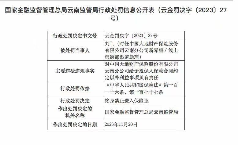 近日,国家金融监督管理总局云南监管局披露一则行政处罚,刘某原是中国大地财产保险股份有限公司(以下简称“大地财险”)云南分公司新零售/线上渠道部渠道助理,对大地财险云南分公司给予投保人保险合同约定以外利益事项负有责任,刘某被罚终身禁止进入保险业。