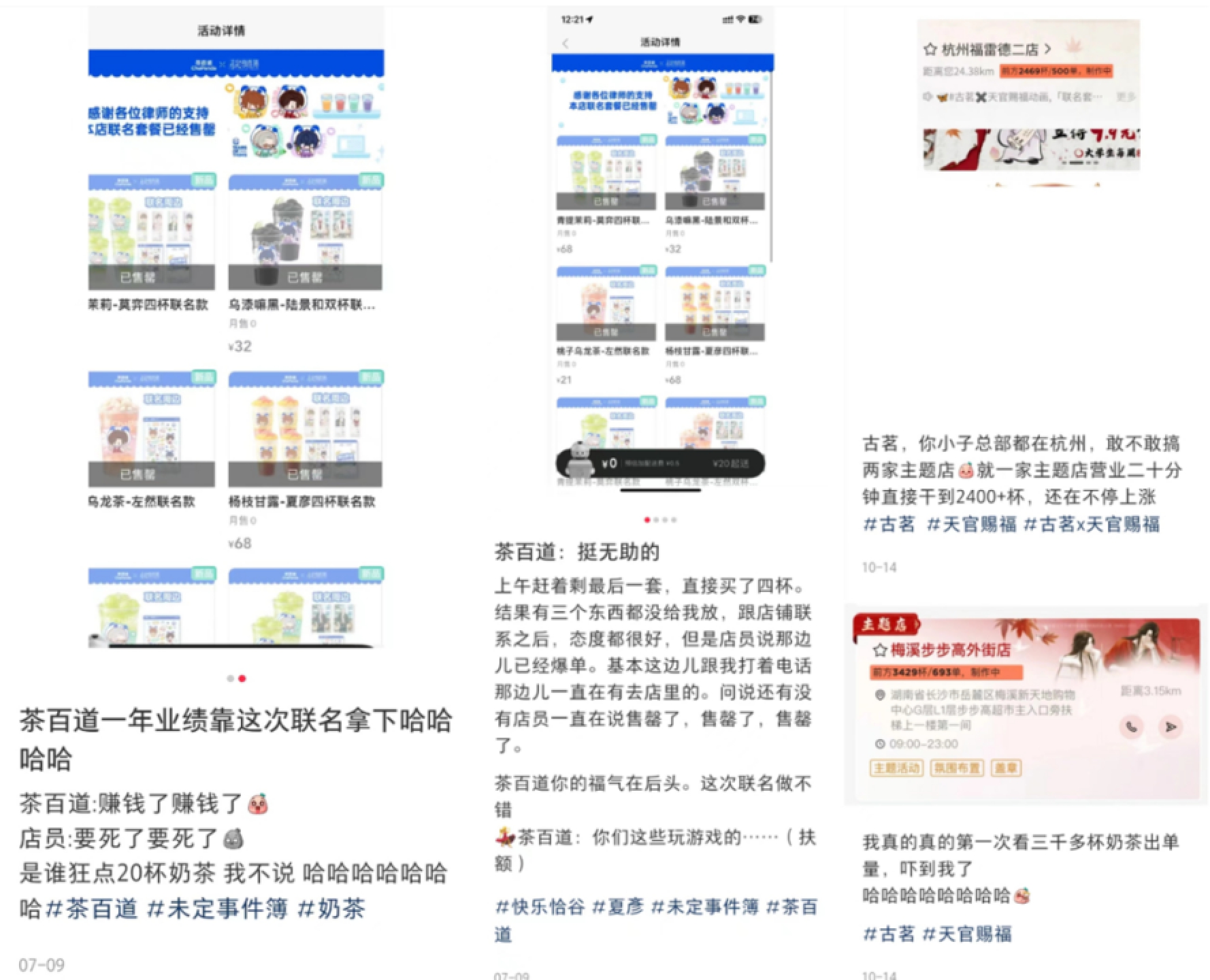 联名在带来高热度的同时也让茶饮店尝到了爆单的甜头。据网友在社交平台分享,在茶百道与未定事件簿联名活动第一天,许多门店就已经出现联名套餐已售罄的标识;古茗与天官赐福联名的线下主题店曾一度出现还有2000多杯甚至3000杯茶饮等待制作的现象。记者走访了此前的联名主题店,店员也回忆道:“当时真的做不完!”