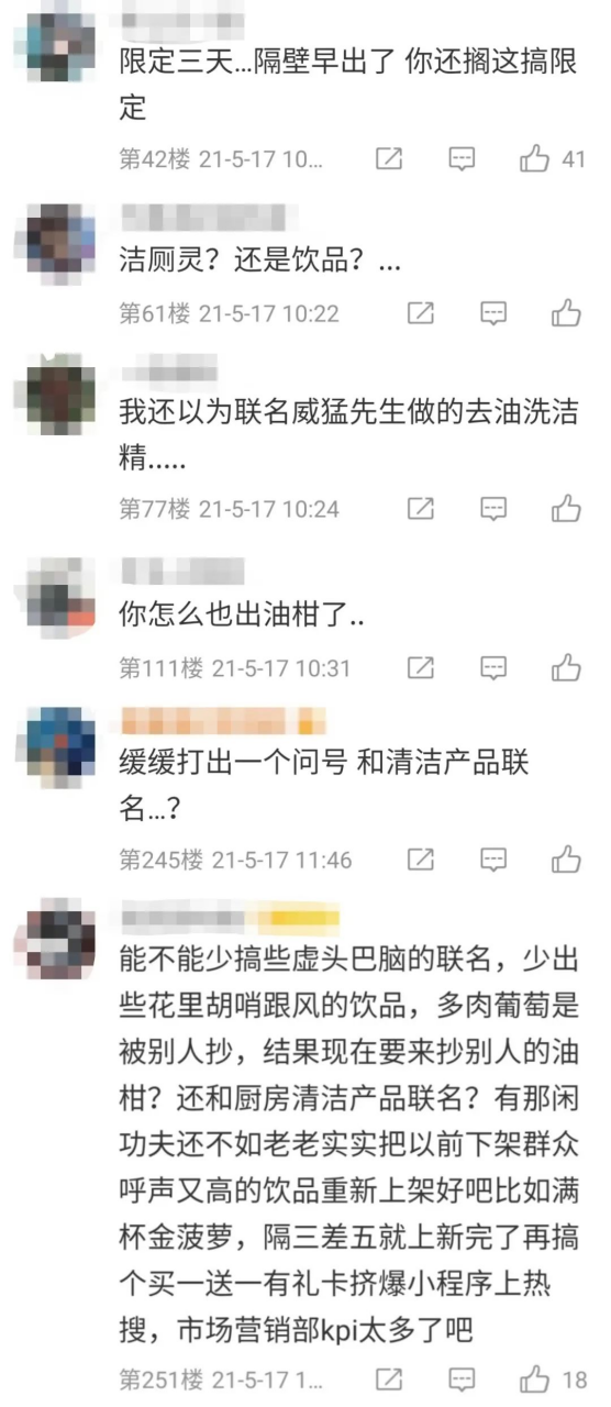 2021年5月,喜茶与清洁品牌威猛先生联名推出油柑茶,其初衷本是借助威猛先生清洁去油的特质突出联名产品刮油解腻的特效,推出后却被网友调侃道“这是洁厕灵还是饮品?” “缓缓打出一个问号”……除此之外,在喜茶推出此联名之前,已有其他品牌推出了油柑茶产品,有网友对此评论“你怎么也出油柑了……”。