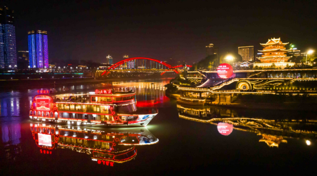 此时此刻,“中国酒都”宜宾,三江六岸、灯火绚烂,街头巷尾、道旗林立。“同心同向同行,共创和美未来”的大会主题标语,在城市核心地段LED大屏循环闪耀;宜宾五粮液机场、宜宾西站等城市地标,以“五粮液”“酒都”等宜宾元素为主题的文化景观流光溢彩、引人瞩目。在历史悠久的钟鼓楼前,五粮液“大魔方”主题景观融汇五粮液历史传承、经典瓶型、标志性建筑和重要奖项等各种元素,生动展示着“大国浓香”的迷人魅力和酒都宜宾的底蕴风采。
