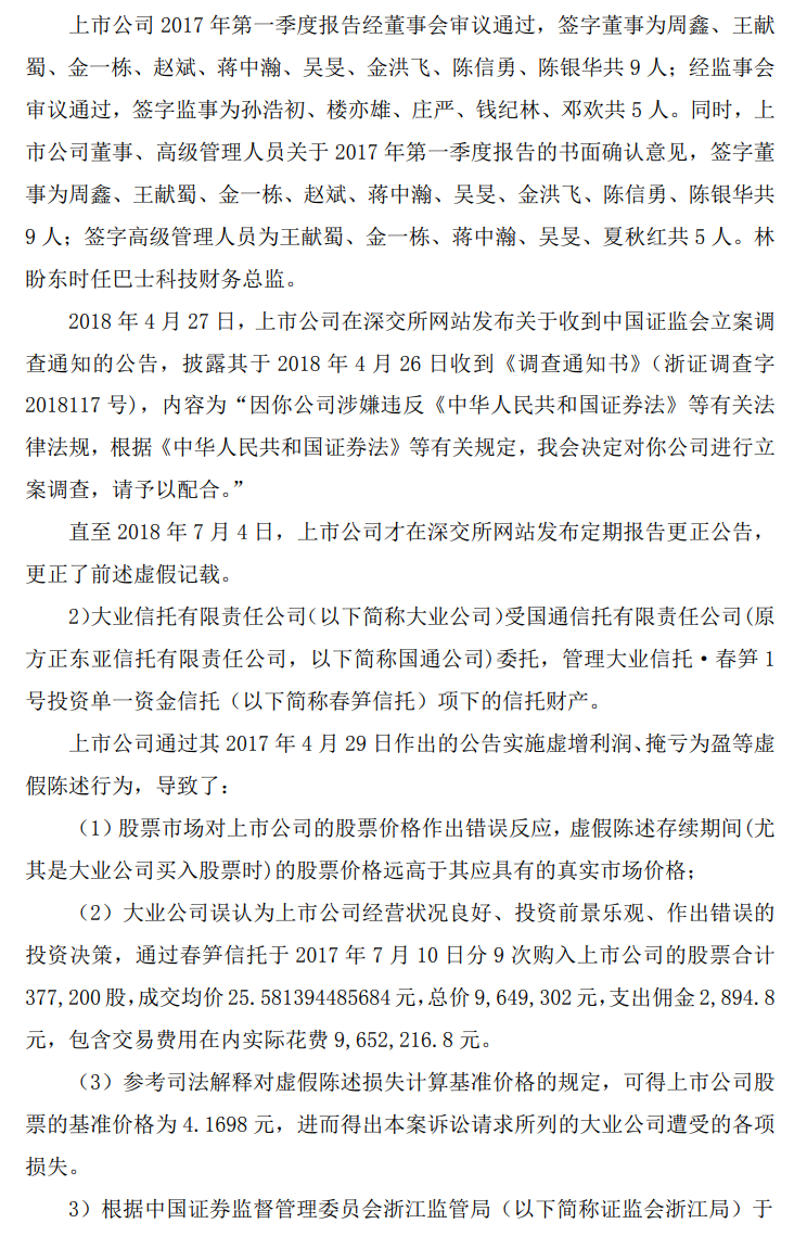 中天服务通过其2017年4月29日作出的公告实施虚增利润、掩亏为盈等虚假陈述行为,导致了大业公司误认为上市公司经营状况良好、投资前景乐观、作出错误的投资决策,通过春笋信托于2017年7月10日分9次购入上市公司的股票合计377,200股,成交均价约25.58元,总价964.93万元,支出佣金2894.8元,包含交易费用在内实际花费965.22万元。