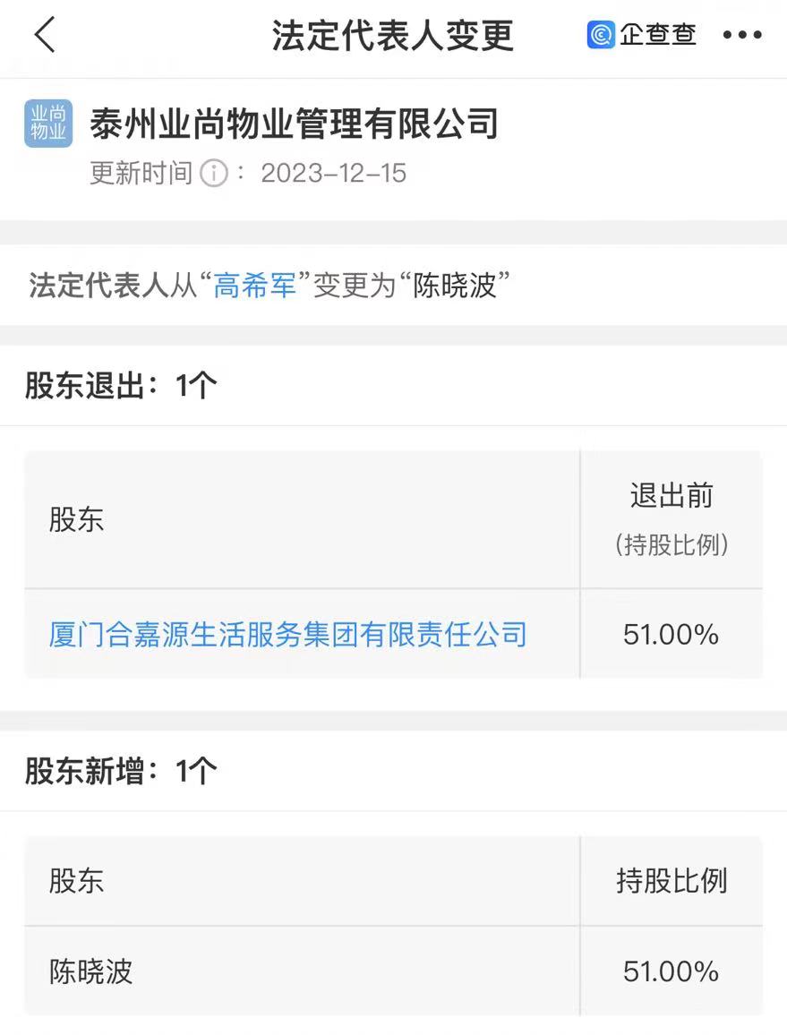 股权变更前,泰州业尚物业的大股东为合嘉源生活服务,持股51%;江苏泰地贸易有限公司(以下简称“泰地贸易”)持股49%。股权变更后,其大股东为陈晓波,持股51%;泰地贸易持股49%。