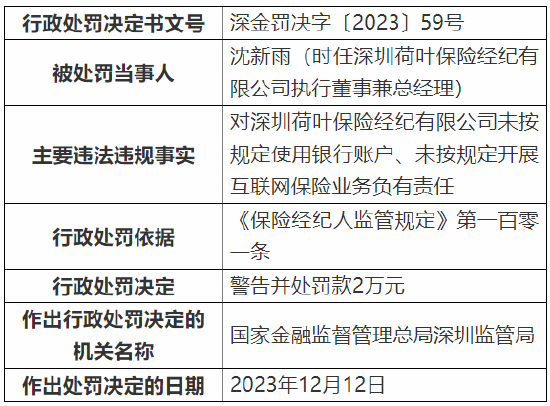 12月15日金融一线消息,国家金融监督管理总局深圳监管局行政处罚信息公开表显示,深圳荷叶保险经纪有限公司因未按规定使用银行账户、未按规定开展互联网保险业务,被国家金融监督管理总局深圳监管局警告并处罚款2万元;该公司执行董事兼总经理沈新雨因对深圳荷叶保险经纪有限公司未按规定使用银行账户、未按规定开展互联网保险业务负有责任,被警告并处罚款2万元。