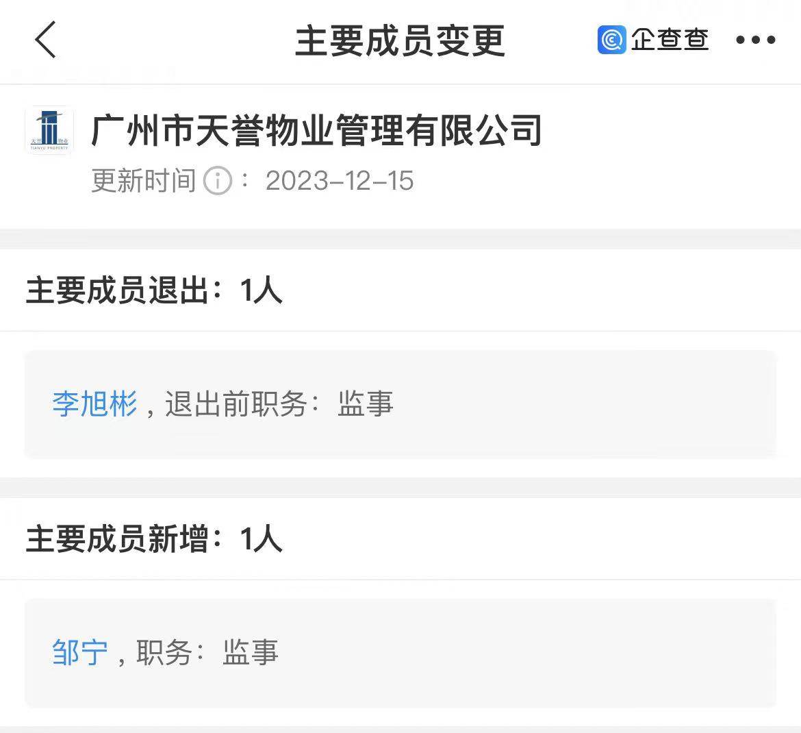 乐居财经 吴文婷12月16日,广州市天誉物业管理有限公司(以下简称“天誉物业”)人事变动,李旭彬退任监事,邹宁接替。