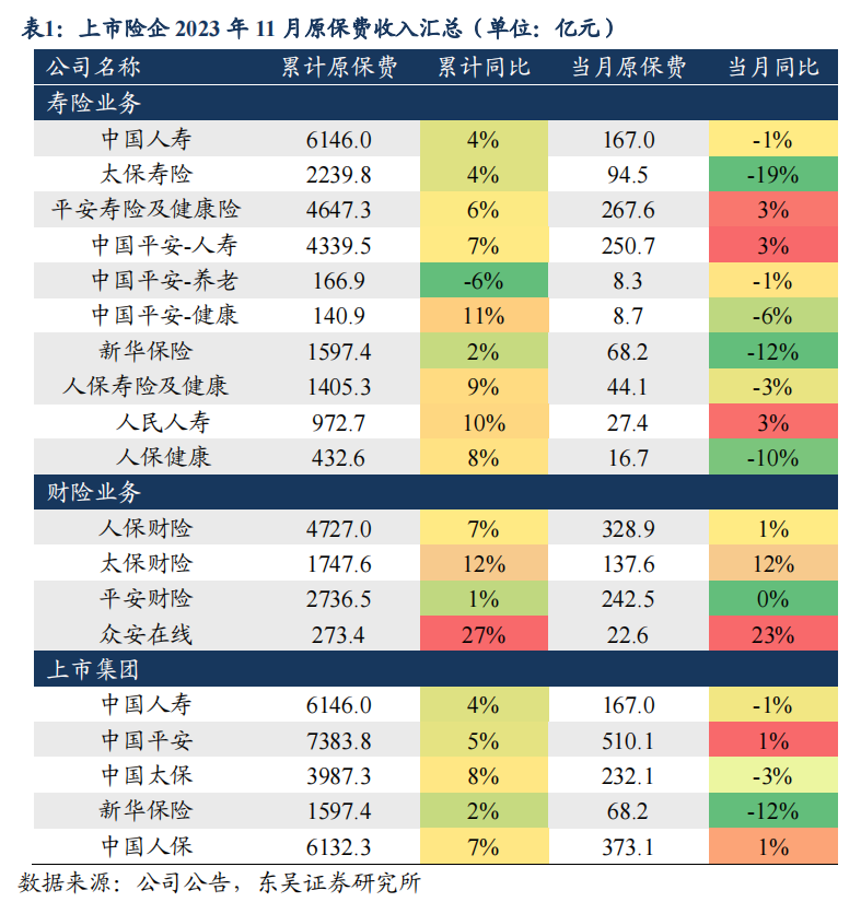对于上市寿险公司11月保费情况,东吴证券最新报告表示,当前仍处于预定利率调整后业务消化期,业务数据仍在深度调整中,11月银保“报行合一”负面影响稍减,原保费同比增速有所回升。