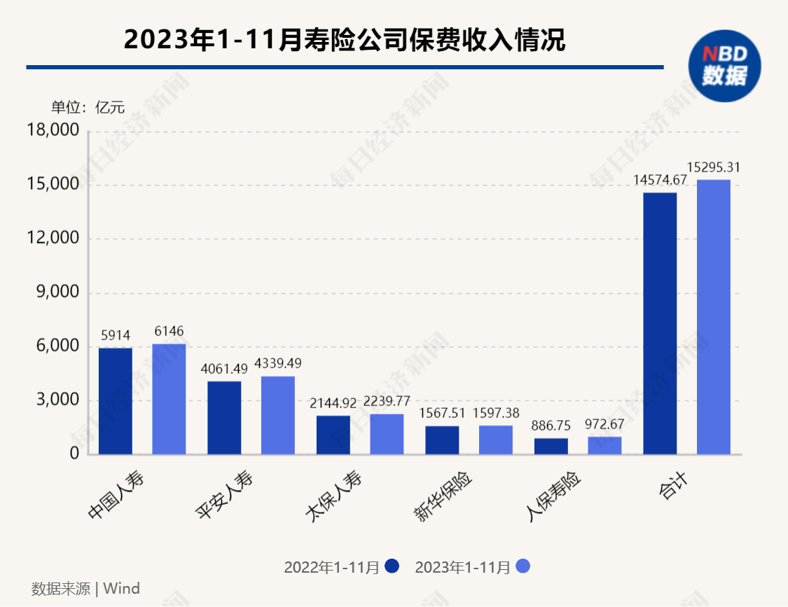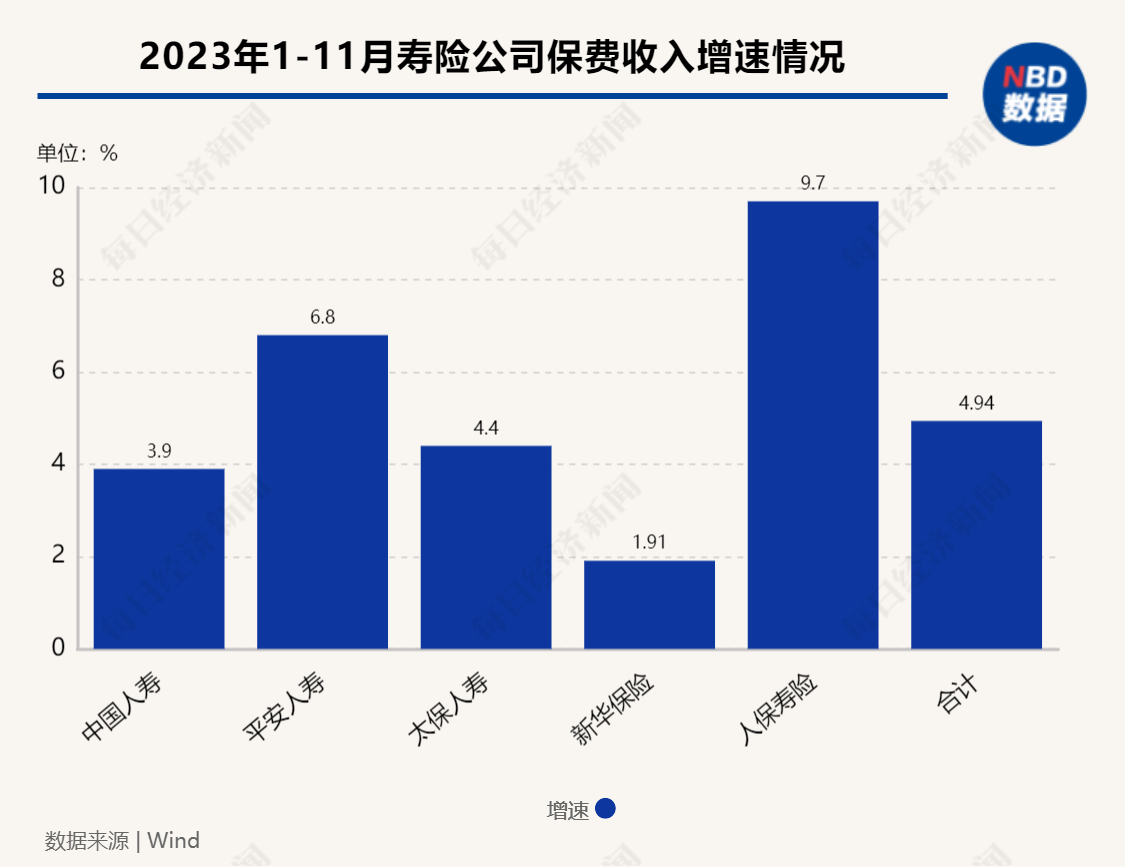 从五大上市寿险公司而言,今年前11个月保费保持正增长态势。数据显示,前11个月,人保寿险、平安人寿、太保寿险、中国人寿、新华保险分别实现原保费收入972.67亿元、4339.49亿元、2239.77亿元、6146亿元、1597.38亿元,对应增速分别为9.7%、6.8%、4.4%、3.9%、1.9%。5家寿险公司合计实现保费收入1.53亿元,同比增长4.94%。