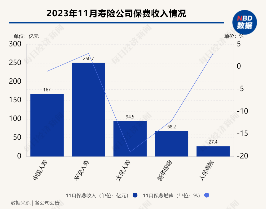从单月保费看,五大上市寿险公司保费增长呈现分化。其中,平安人寿实现原保费收入250.67亿元,同比增长2.9%;人保寿险实现原保费收入27.41亿元,同比增长2.8%。