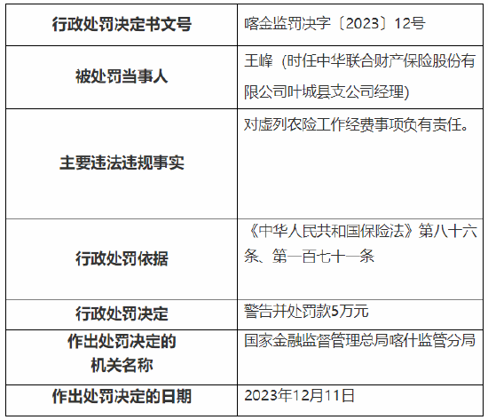 中华联合财产保险股份有限公司叶城县支公司因虚列农险工作经费,被国家金融监督管理总局喀什监管分局罚款22万元;一名相关责任人被警告并处罚款5万元。