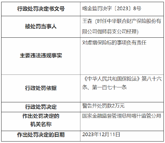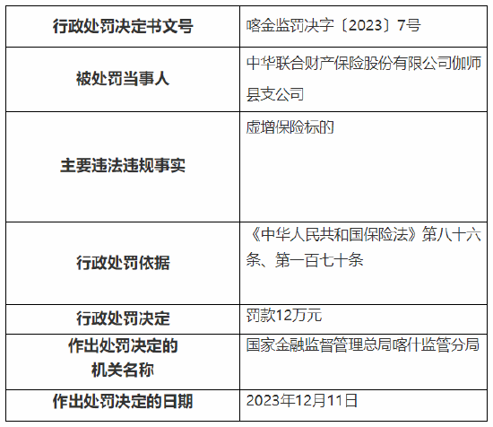 12月18日金融一线消息,国家金融监督管理总局喀什监管分局行政处罚信息公开表显示,中华联合财产保险股份有限公司伽师县支公司因虚增保险标的,被国家金融监督管理总局喀什监管分局罚款12万元;一名相关责任人被警告并处罚款2万元。