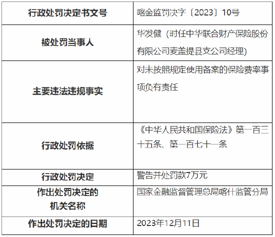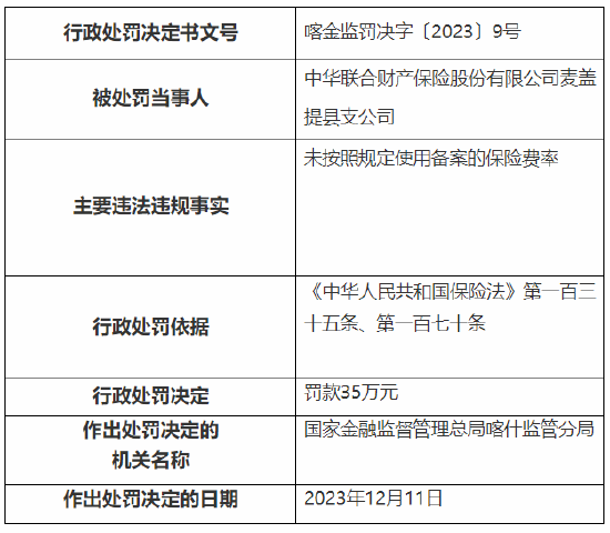 中华联合财产保险股份有限公司麦盖提县支公司因未按照规定使用备案的保险费率,被国家金融监督管理总局喀什监管分局罚款35万元;一名相关责任人被警告并处罚款7万元。