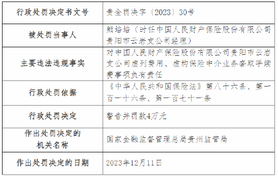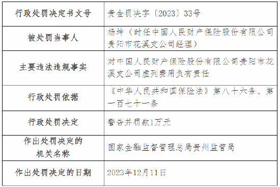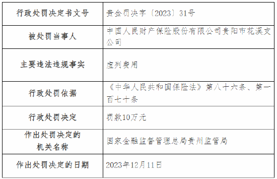中国人民财产保险股份有限公司贵阳市花溪支公司因虚列费用,被国家金融监督管理总局贵州监管局罚款10万元;一名相关责任人被警告并罚款1万元。