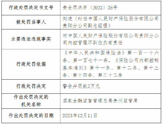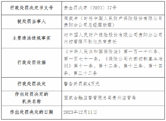 12月18日金融一线消息,国家金融监督管理总局贵州监管局行政处罚信息公开表显示,中国人民财产保险股份有限公司贵阳分公司因内控管理不到位,被国家金融监督管理总局贵州监管局罚款15万元;两名相关责任人被警告,并累计罚款6万元。