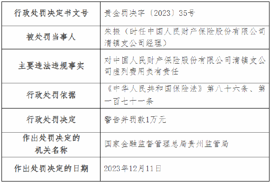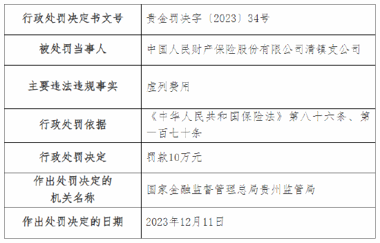 中国人民财产保险股份有限公司清镇支公司因虚列费用,被国家金融监督管理总局贵州监管局罚款10万元;一名相关责任人被警告并罚款1万元。