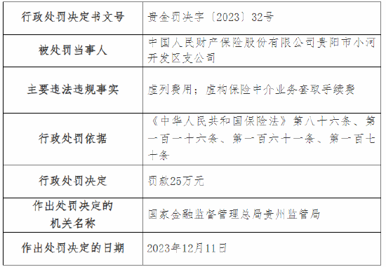 中国人民财产保险股份有限公司贵阳市小河开发区支公司因虚列费用、虚构保险中介业务套取手续费,被国家金融监督管理总局贵州监管局罚款25万元。